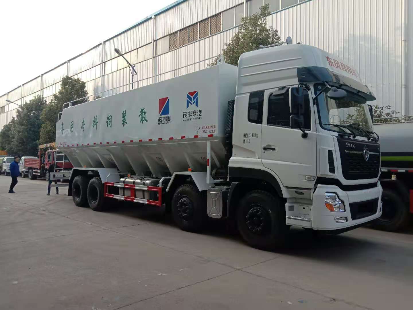 東風天錦豪華駕駛室,康明斯6缸180馬力發(fā)動機,法士特8檔變速箱,5000mm軸距,10.00R20鋼絲胎,電動門窗,中控門鎖,原廠空調,ABS,方向助力,汽車記錄儀,斷氣剎;上裝罐體容積約22立方,罐體采用4mm優(yōu)質碳鋼板制作,罐體內分為叁個倉,可獨立控制各分倉卸料順序和速度,整車3條蛟龍(底部水平絞龍、尾部垂直絞龍、頂部卸料絞龍),由3個5.5kw 380v電機帶動各絞龍工作,頂部絞龍液壓控制舉升,可左右旋轉180°,整車尺寸:9000×2500×3800mm