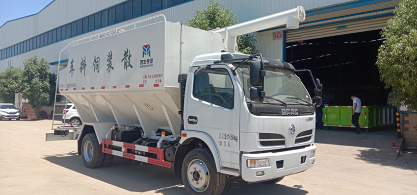 散裝飼料運(yùn)輸車(chē),散裝飼料車(chē)的飼料罐架設(shè)在卡車(chē)的底盤(pán)上,罐頂開(kāi)有進(jìn)料口.頂部的一根螺旋輸送卸料管(俗稱卸料絞龍)則可自由回轉(zhuǎn)和抬升,抬升的仰角可達(dá)60度。運(yùn)輸時(shí),頂部的螺旋管平臥在罐頂;卸料時(shí)則抬起,使管端的出料口與畜禽飼養(yǎng)場(chǎng)貯料罐頂部的進(jìn)料門(mén)相接,駕駛室內(nèi)裝有操縱裝置(操縱裝置也可裝置在罐體尾部),卸料時(shí)通過(guò)車(chē)底的動(dòng)力輸出軸和減速器來(lái)驅(qū)動(dòng)螺旋,以完成卸料。